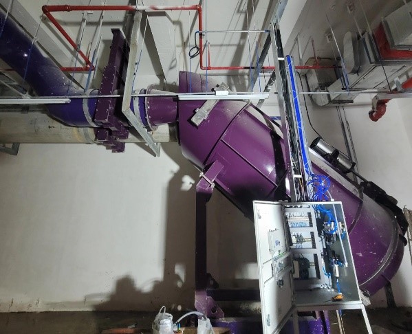 傳輸管網(wǎng)系統(tǒng)由高負(fù)壓氣流運作的水平管道組成,將暫存在排放閥室內(nèi)的垃圾或污衣被服輸送至收集站進(jìn)行進(jìn)一步回收。管網(wǎng)可隨醫(yī)院建筑工程進(jìn)度進(jìn)行安裝,可吊裝于地下室上空或埋地安裝于室外。管網(wǎng)由不銹鋼或碳鋼管道、彎頭、三通、檢修門、閥門及電氣控制裝置組成。考慮到被服需清洗循環(huán)使用,建議輸送污衣被服的管道采用不銹鋼材質(zhì),以保證管道內(nèi)壁光滑,降低損耗率。