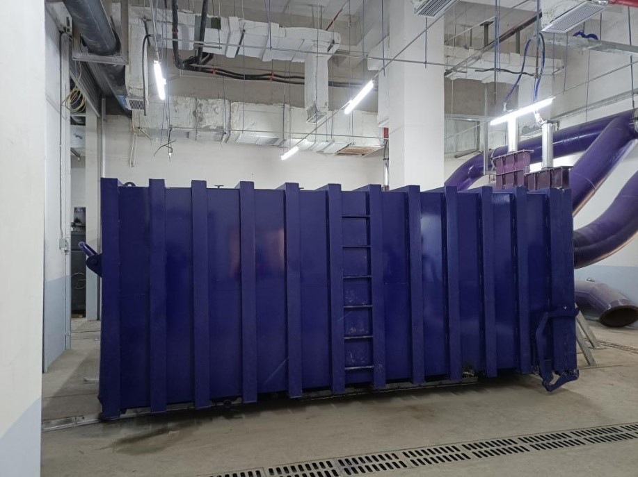 ③ 除塵除臭過濾裝置處理后才能排至室外大氣,因此在負(fù)壓式垃圾被服動力收集系統(tǒng)的末端,要設(shè)置特別設(shè)計的多層活性炭過濾裝置,起到除塵及除臭的作用。除塵除臭過濾裝置為單獨的設(shè)備,安裝在機(jī)房內(nèi),并與抽風(fēng)機(jī)相連接,故工作時內(nèi)部承受巨大的負(fù)壓。過濾器底部設(shè)有過濾垃圾收集器,收集器可旋轉(zhuǎn)打開并進(jìn)行日常清理。